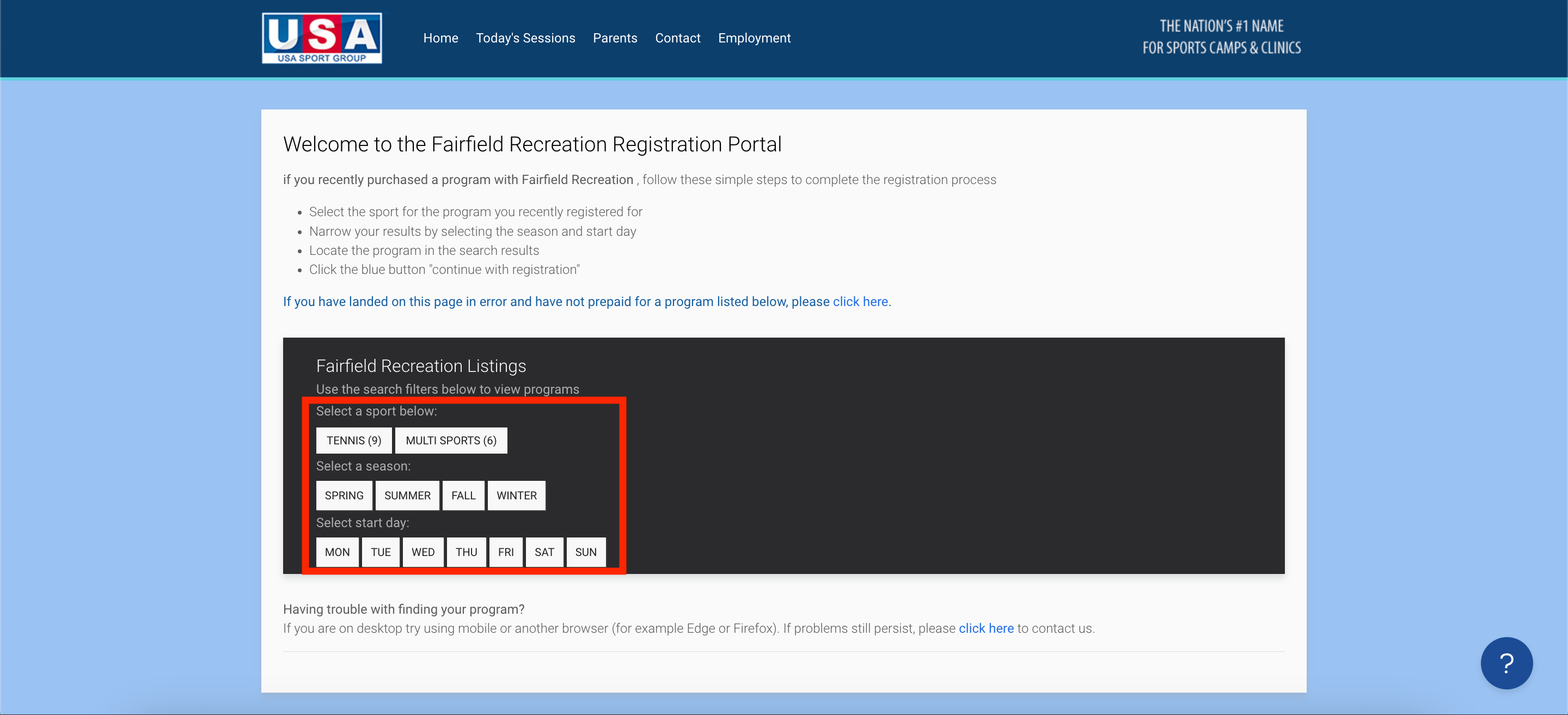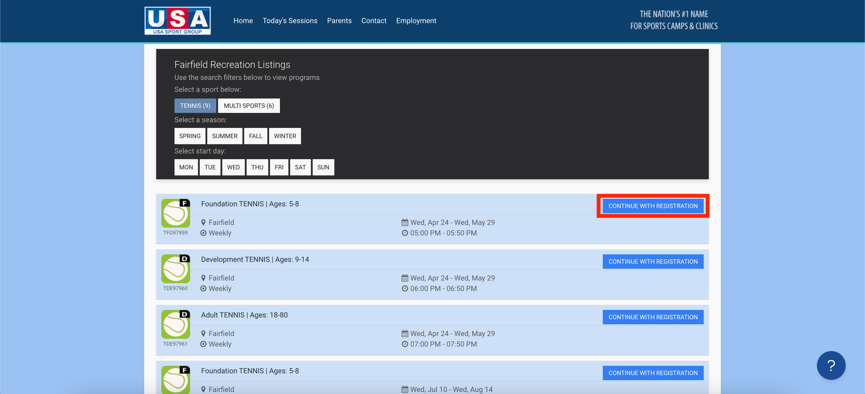 - Once you arrive on the organization's program page, use the filters in the listings box to find the program you registered for. When you locate said program, click the blue "CONTINUE WITH REGISTRATION" button.